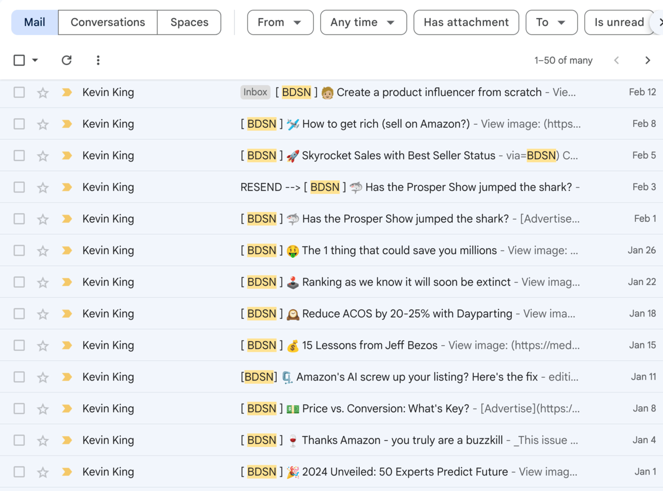 More recently, Kevin launched the Billion Dollar Newsletter. I’ve been a fan from the first email (hack, I was even the first “Dream 100” member), and I know that I can go to my inbox and type “BDSN + keyword” and find something on that topic.